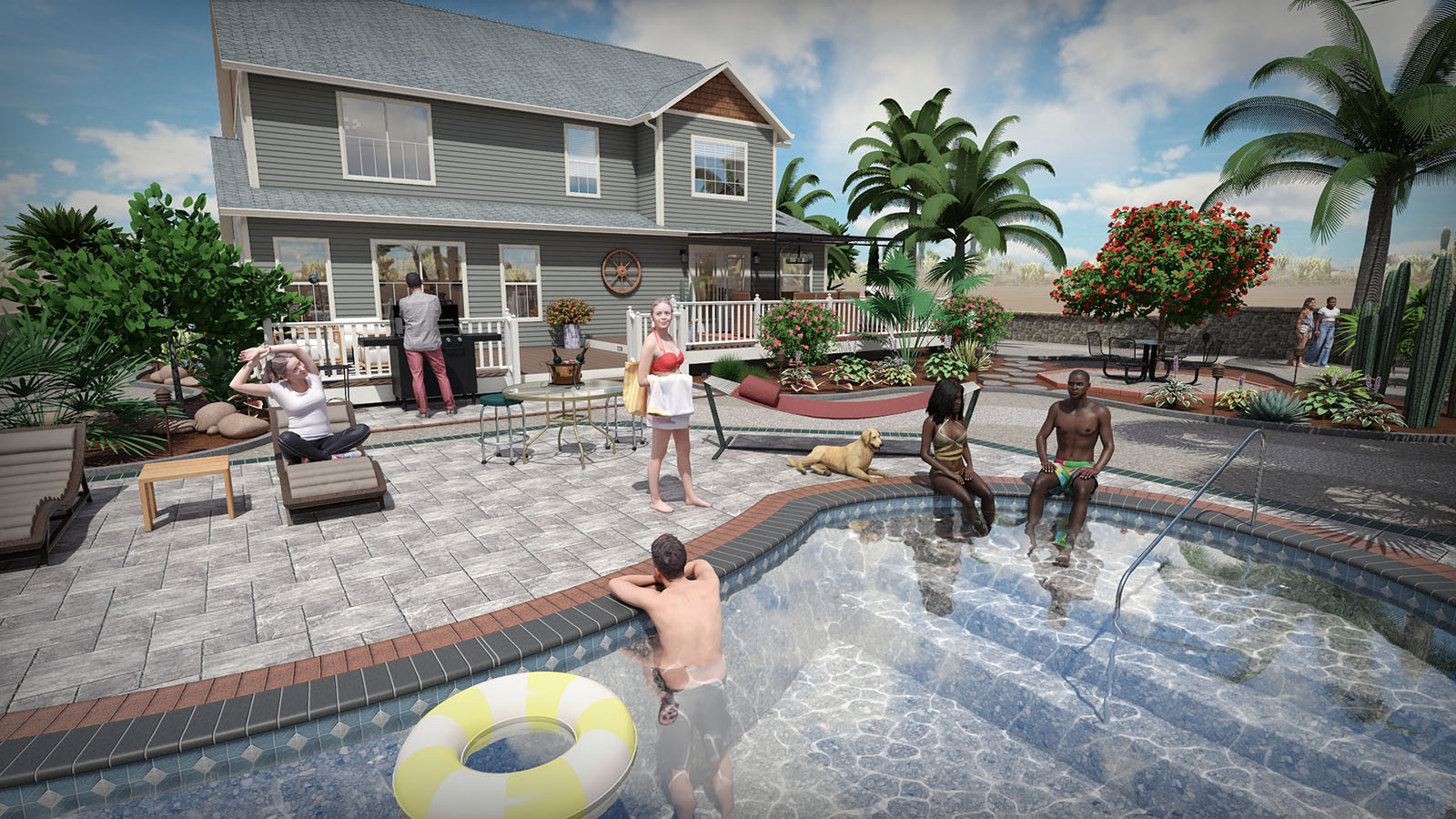 When your design is finished, view your swimming pools and spas with realistic reflections, flowing water, and other effects.