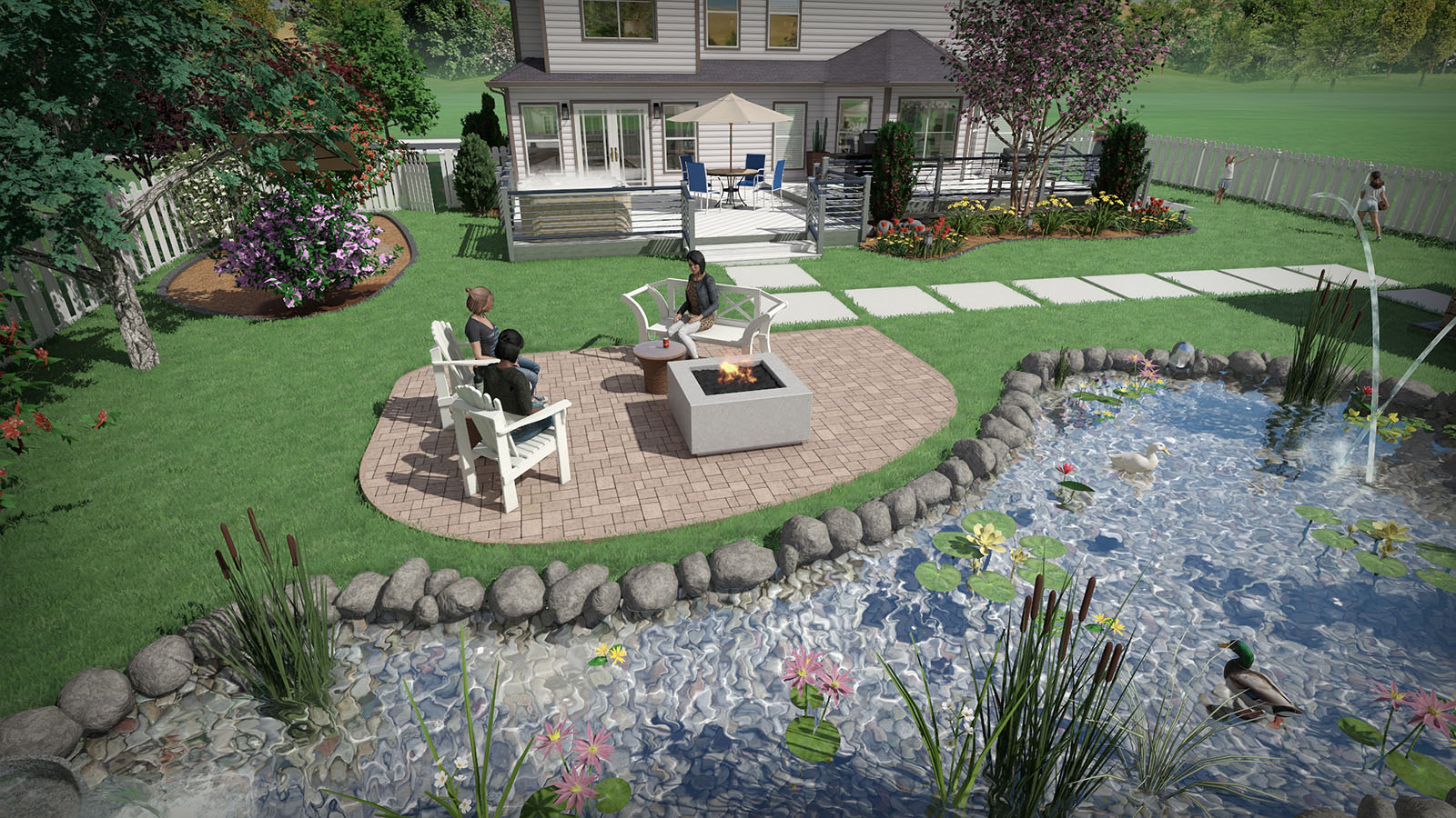 Using our exclusive Realtime Walkthrough feature, you can walk around your landscape designs in real-time, complete with flowing water, koi fish, and other effects.