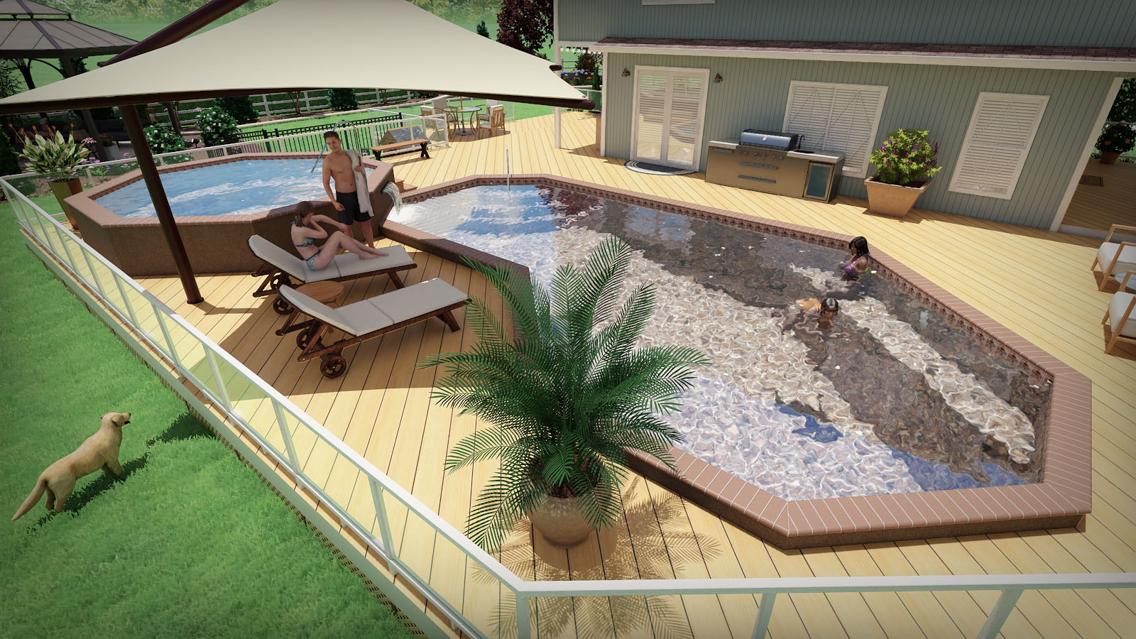 Above ground swimming pools are created in the same freeform fashion as below ground pools, and are simply elevated with a few clicks of the mouse.